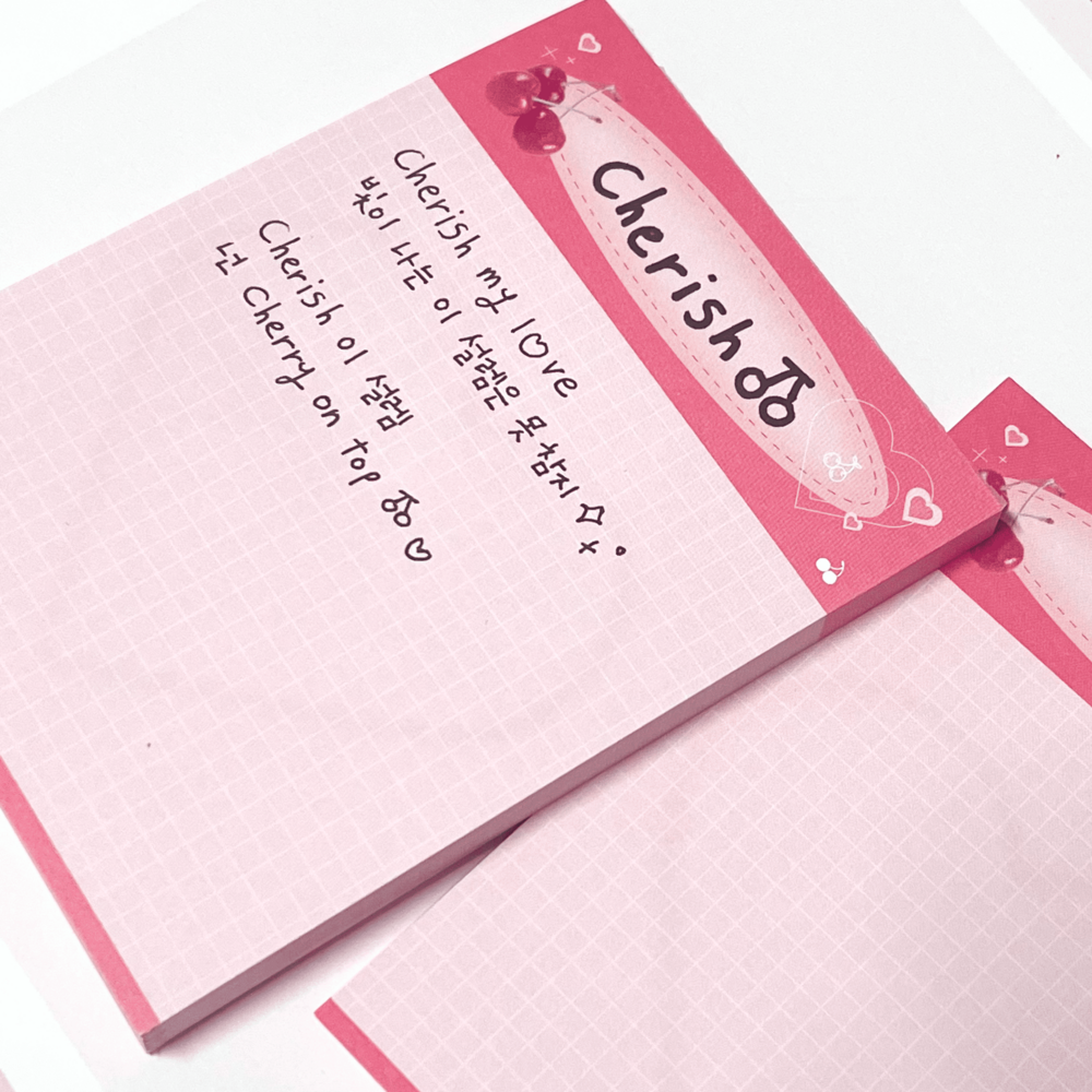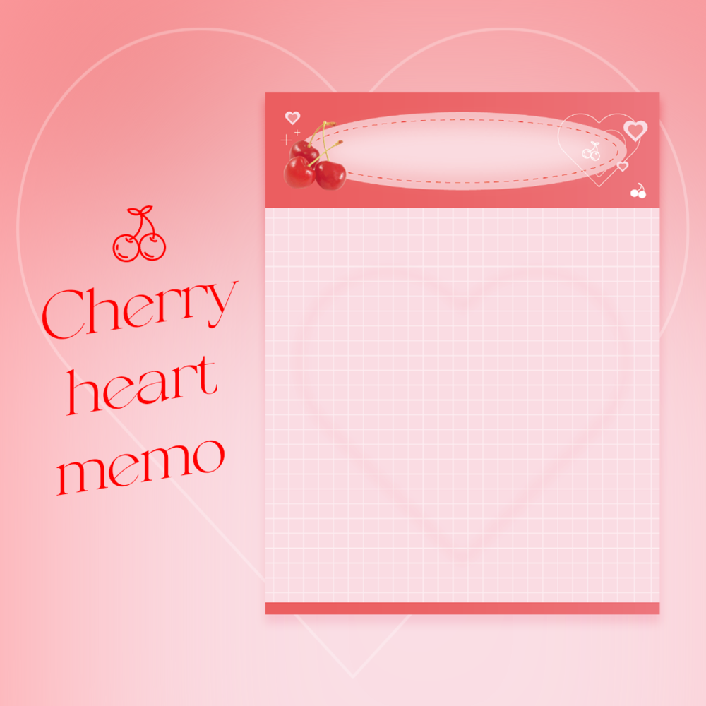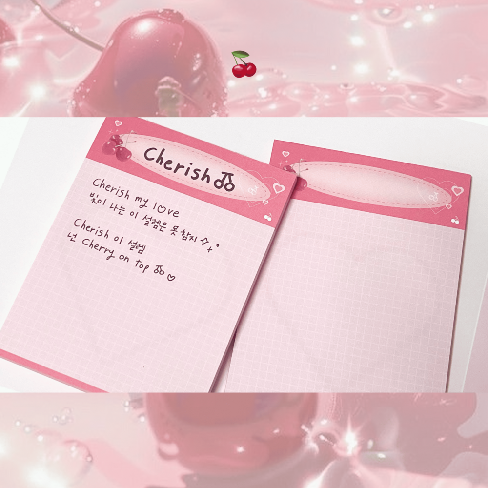 키치한 감성의, 귀여운 체리와 하트가 포인트인 체리 색감의 떡메모지입니다.